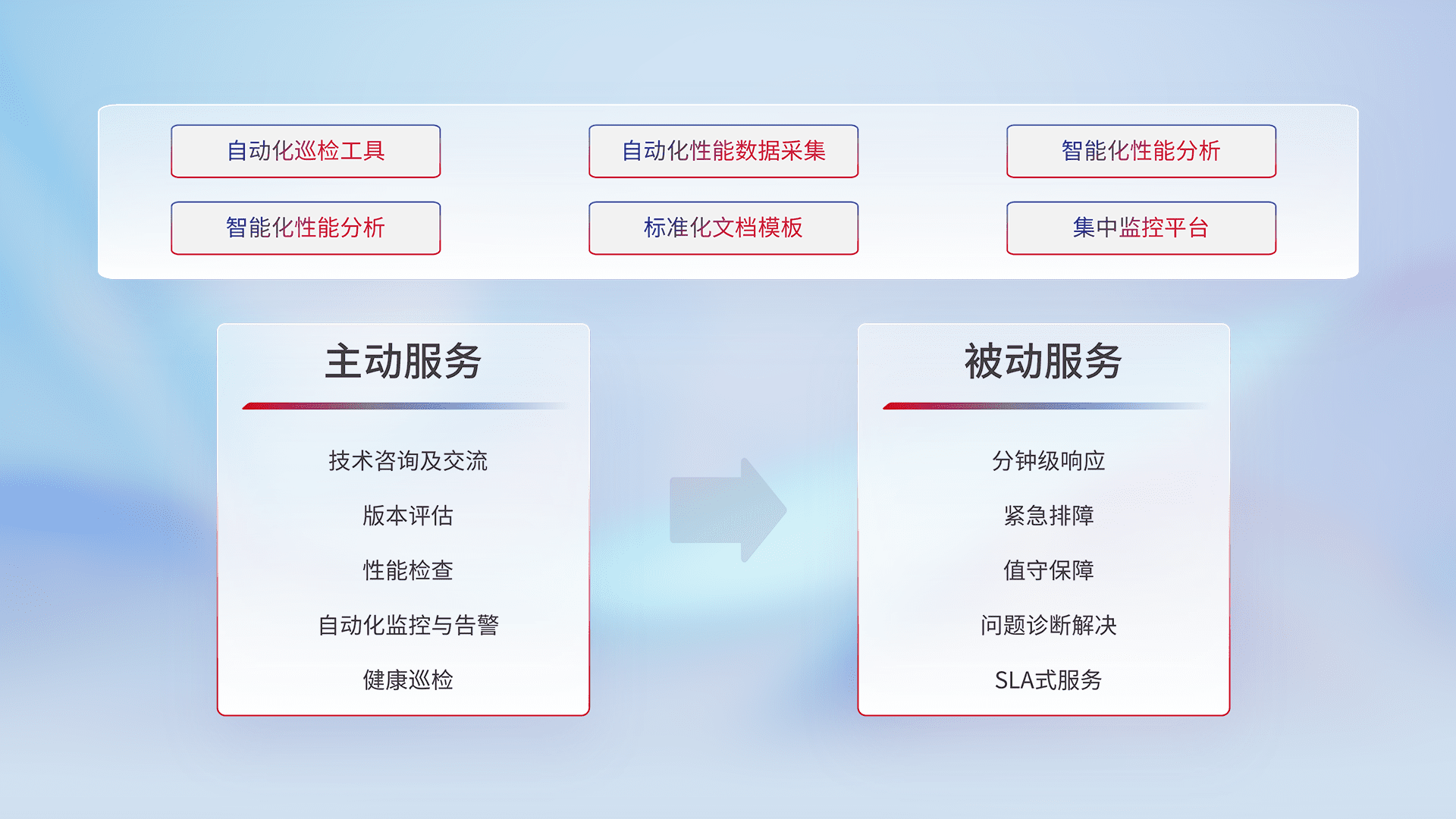 智能化工具和标准化文档,,,保障服务质量,,,,提供主动服务(包含技术咨询、、、、版本评估、、、性能检查、、、、自动化监控与告警、、健康巡检)和被动服务包含(分钟级响应、、、紧急排障、、值守保障、、问题诊断解决、、SLA服务)。。