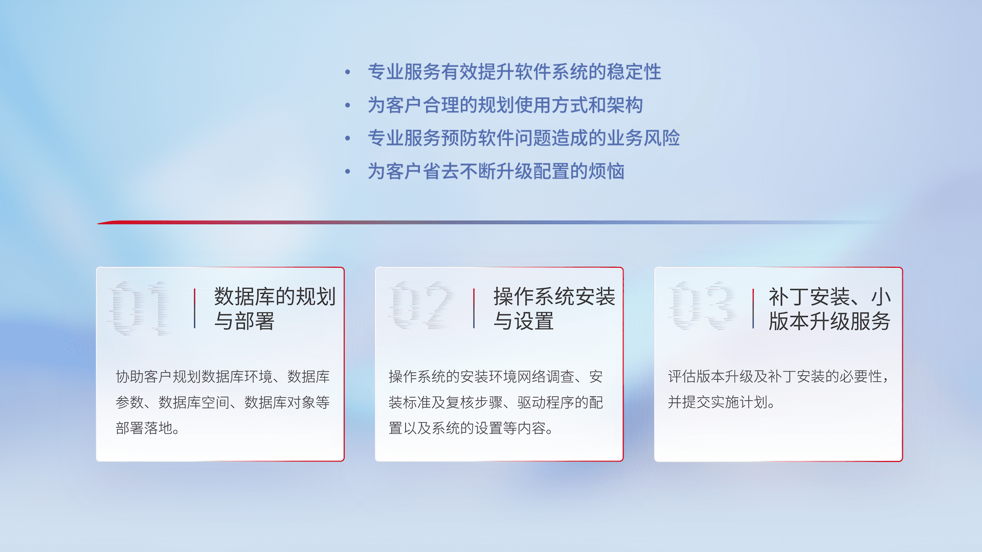 为客户提供软件规模升级、、、快速部署、、、按需配置的专业服务,,从数据库的规划与部署到操作系统的安装与设置,,,再到补丁安装和小版本升级提供支持。。。